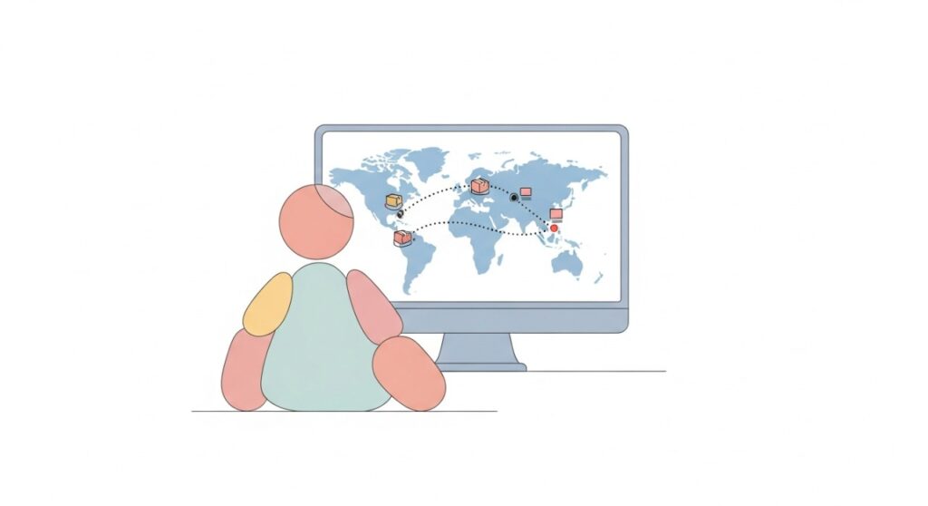 Seseorang sedang menjejaki status penghantaran bungkusan antarabangsa pada skrin komputer.
